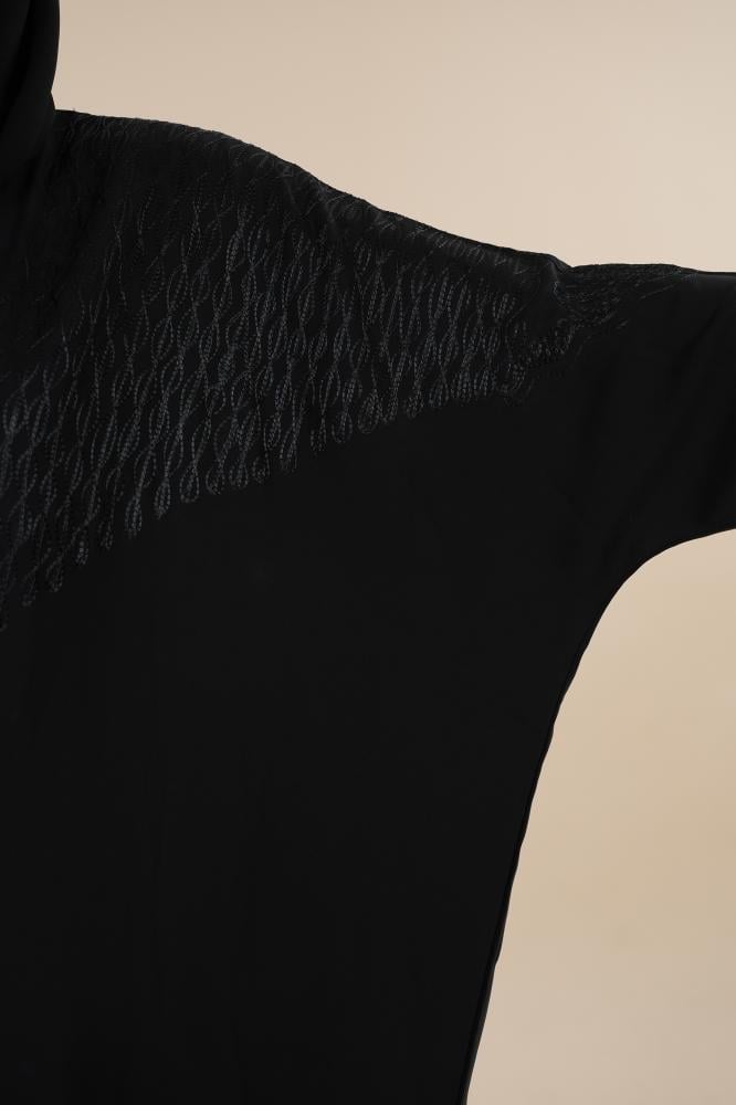 تأتي العباية بقصّة بشت أنيقة تضفي مظهراً فخماً وانسيابياً يعكس الذوق الرفيع، مع تصميم مريح يجعلها مثالية للاستخدام اليومي أو المناسبات البسيطة.